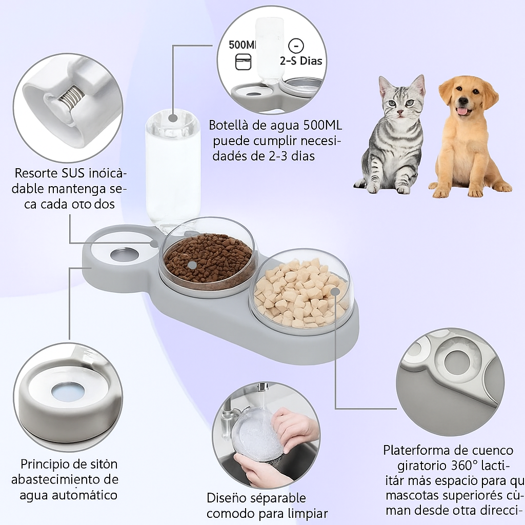 Este comedero doble con dispensador de agua automático es la solución perfecta para mantener alimentadas e hidratadas a tus mascotas de forma práctica y ordenada.